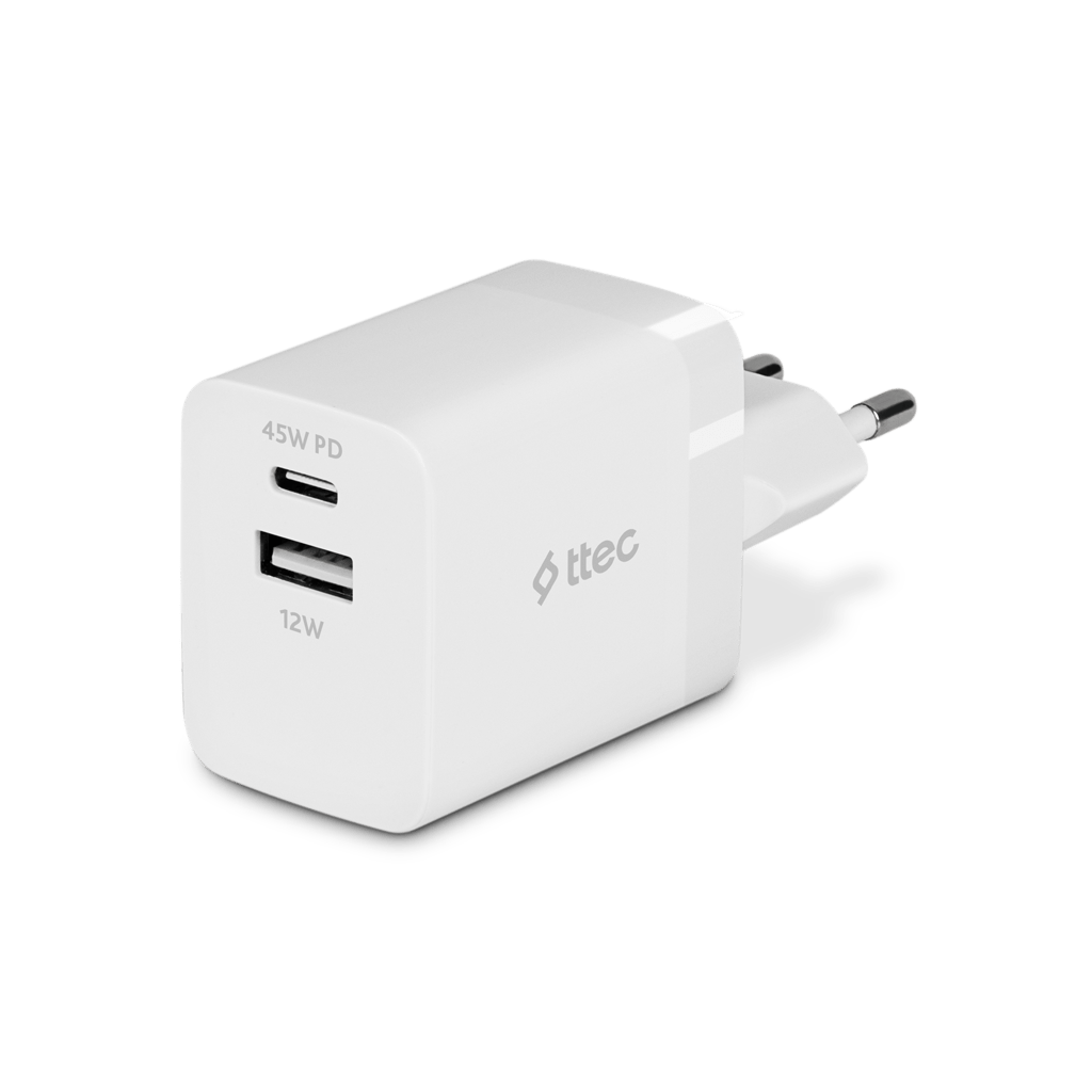 ttec SmartCharger Duo PD 45W Travel Fast Charger USB-C+USB-A 2SCP02S
